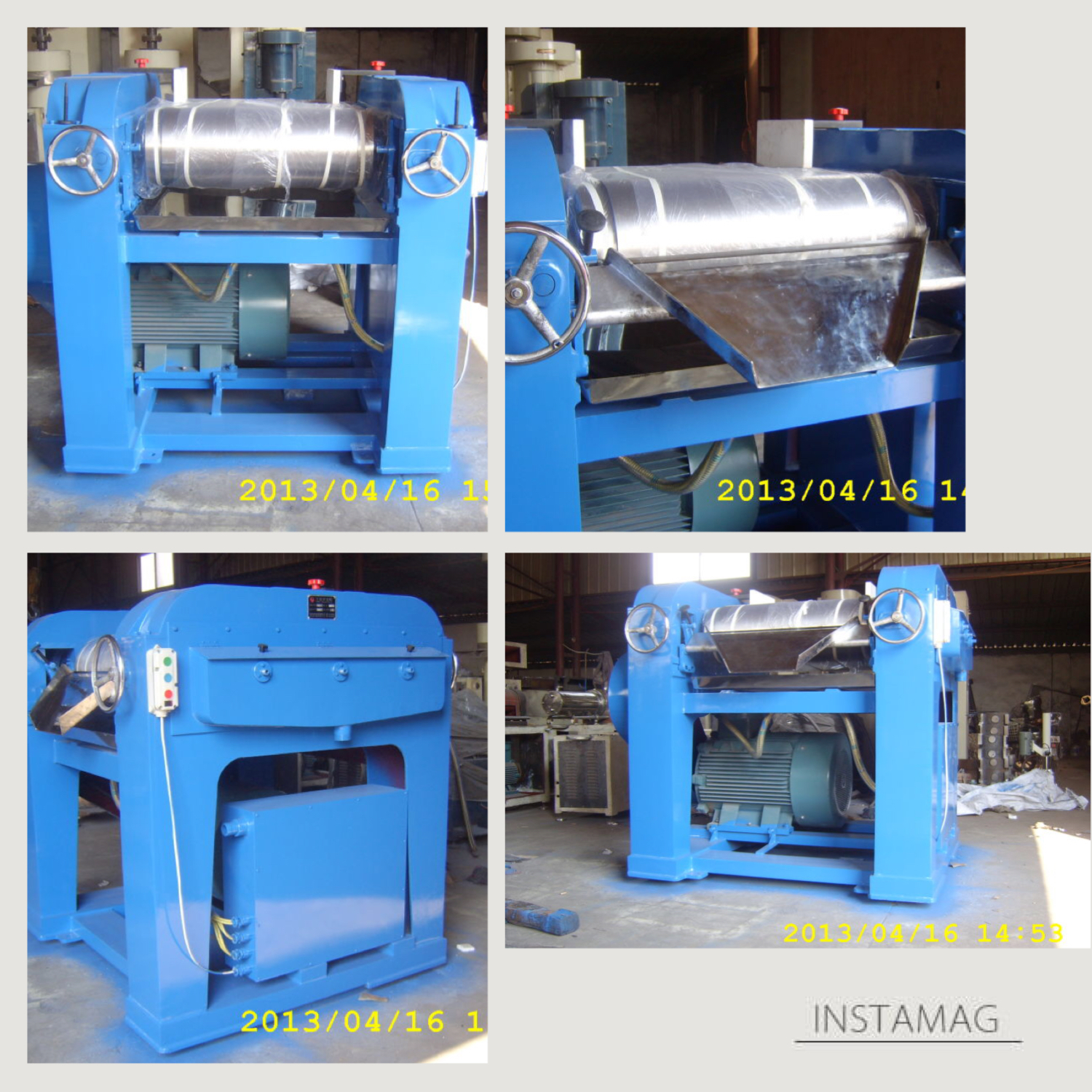 三輥研磨機適用于細度要求較高的膏體或高粘度物料使用。該機通過水平的三根輥筒的表面相互擠壓,手動式調(diào)節(jié)輥筒之間的間距,以不同速度的摩擦達到研磨效果??裳b有緊急制動按鈕,防止落入異物導致的設備損壞。輥子使用特殊硬質(zhì)合金澆鑄而成;也可以使用大理石材質(zhì)。傳動采用鏈條傳動、齒輪調(diào)輥。