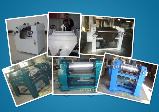 該設(shè)備由三個(gè)輥筒組成,裝在一個(gè)機(jī)架上,由電機(jī)直接帶動(dòng)。一般輥筒間的轉(zhuǎn)動(dòng)方向不同,前輥向前轉(zhuǎn)動(dòng),中輥向后轉(zhuǎn)動(dòng)。輥?zhàn)愚D(zhuǎn)速前輥快、后輥慢。中間輥固定,前后兩輥裝在滑道上,有彈簧裝置,用手輪調(diào)節(jié)前后輥與中輥的距離。物料由后輥與中輥之間進(jìn)入,受到輥筒的擠壓,產(chǎn)品顆粒變細(xì),然后由快輥帶出,快輥末端裝有刮刀,使物料與輥筒分離,落入收集桶內(nèi)。由于研磨過(guò)程產(chǎn)生大量熱量,各輥筒的中心是設(shè)計(jì)為空心結(jié)構(gòu),通水冷卻,保證產(chǎn)品質(zhì)量。