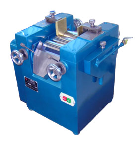 該設(shè)備由三個(gè)輥筒組成,裝在一個(gè)機(jī)架上,由電機(jī)直接帶動(dòng)。一般輥筒間的轉(zhuǎn)動(dòng)方向不同,前輥向前轉(zhuǎn)動(dòng),中輥向后轉(zhuǎn)動(dòng)。輥?zhàn)愚D(zhuǎn)速前輥快、后輥慢。中間輥固定,前后兩輥裝在滑道上,有彈簧裝置,用手輪調(diào)節(jié)前后輥與中輥的距離。物料由后輥與中輥之間進(jìn)入,受到輥筒的擠壓,產(chǎn)品顆粒變細(xì),然后由快輥帶出,快輥末端裝有刮刀,使物料與輥筒分離,落入收集桶內(nèi)。由于研磨過程產(chǎn)生大量熱量,各輥筒的中心是設(shè)計(jì)為空心結(jié)構(gòu),通水冷卻,保證產(chǎn)品質(zhì)量。